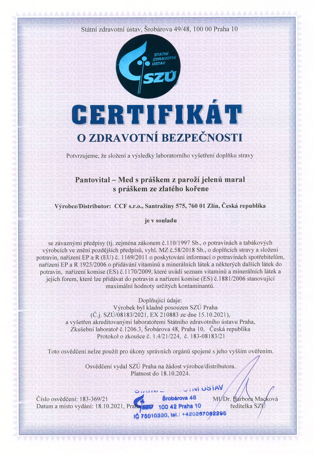 Produkt splňuje certifikaci českého Státního zdravotního ústavu.