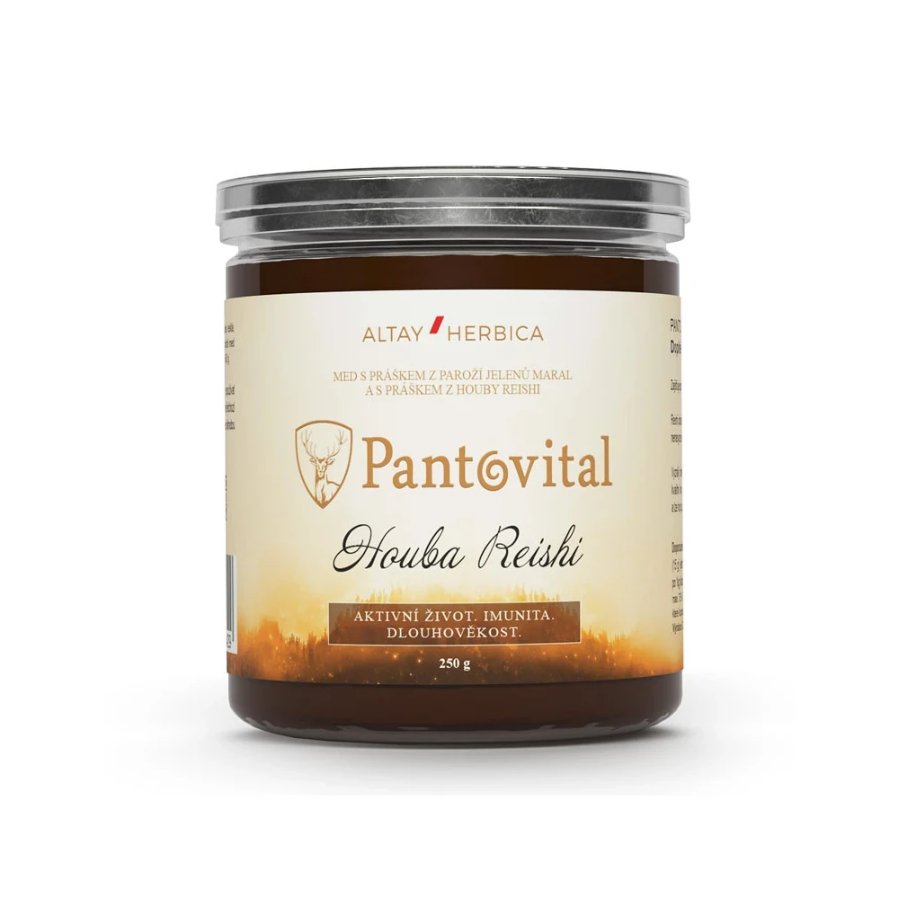 Složení: Přírodní med, prášek z paroží jelenů maral, houba Reishi (Lesklokorka lesklá).