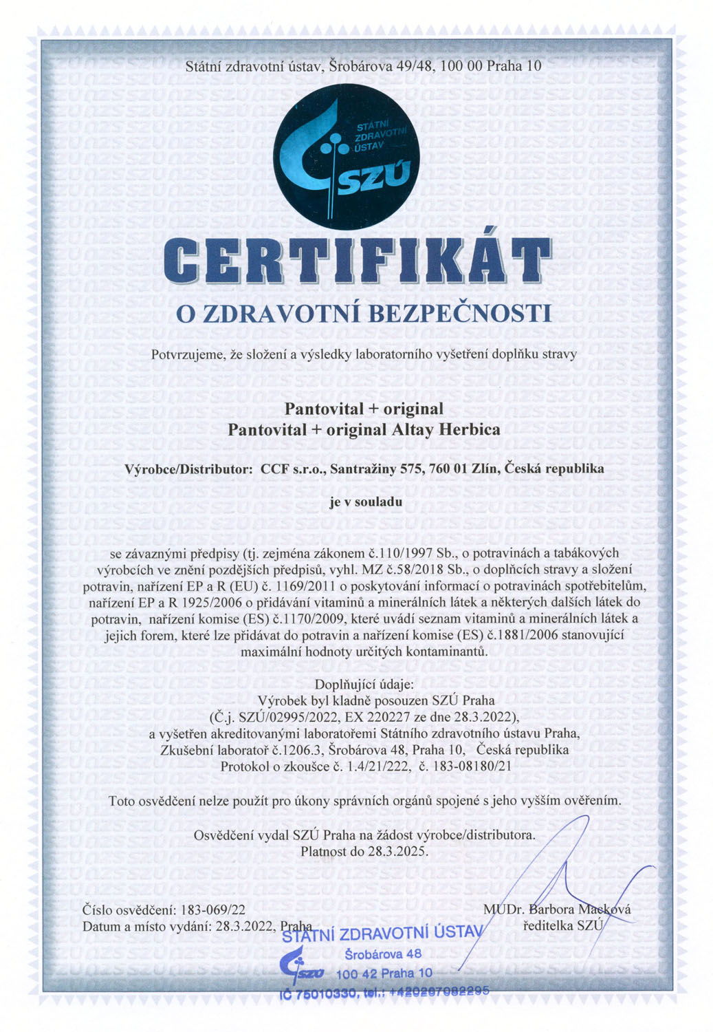 Produkt splňuje certifikaci českého Státního zdravotního ústavu.