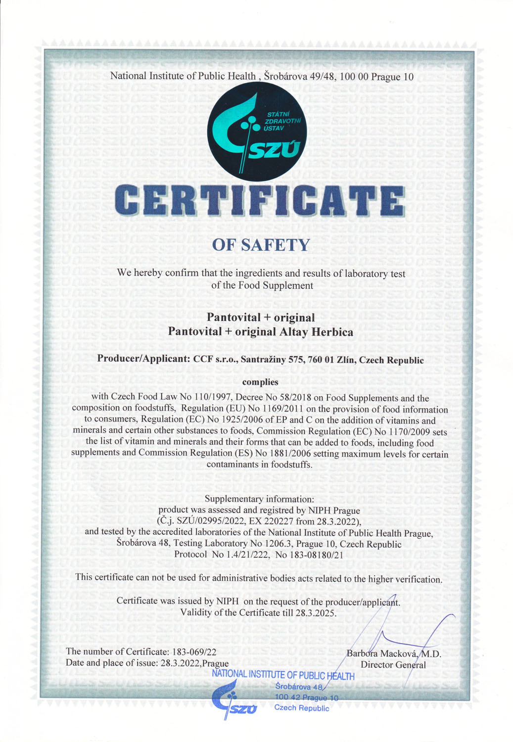 Das Produkt erfüllt die Zertifizierung des tschechischen Staatlichen Gesundheitsinstituts.