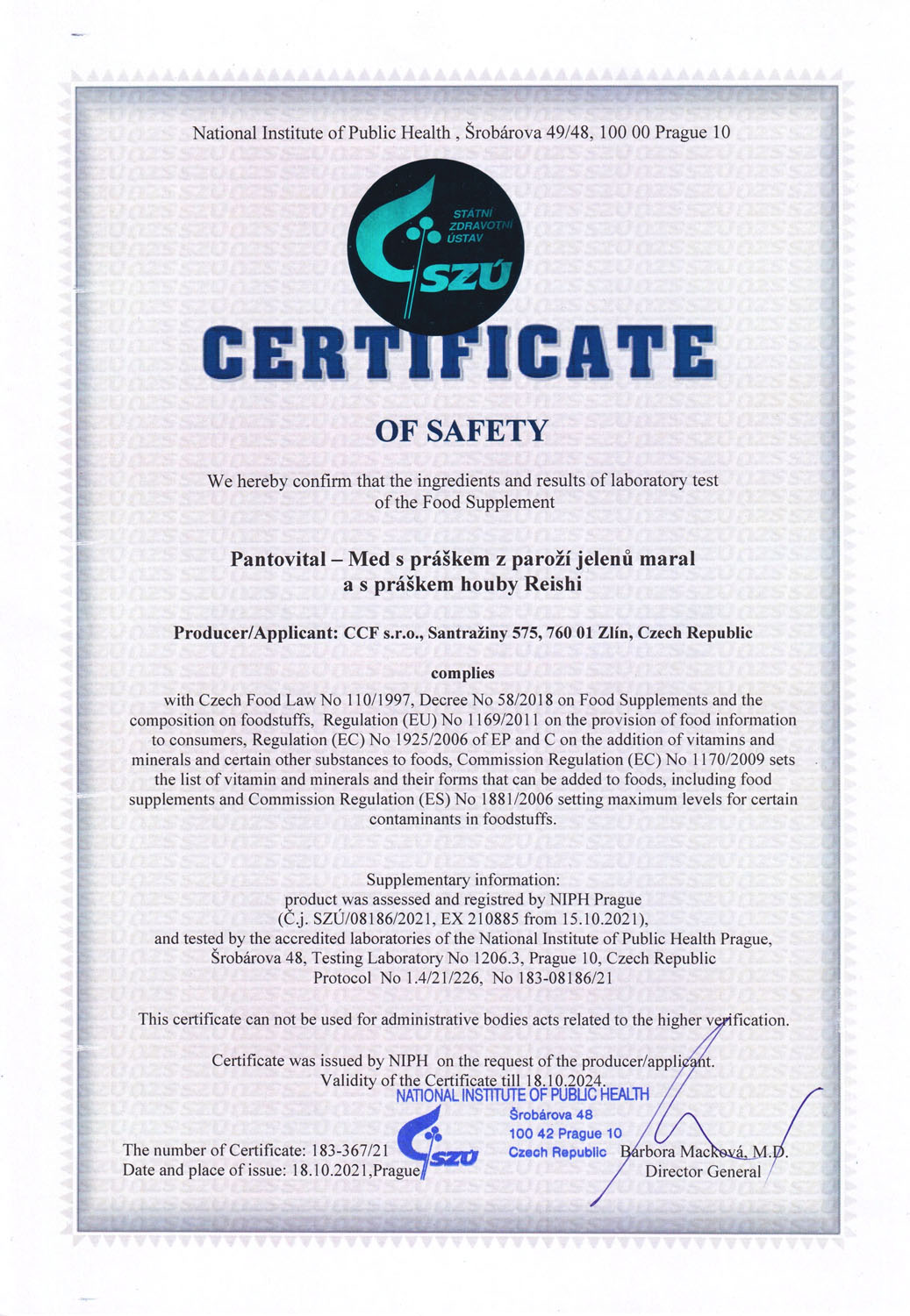 Das Produkt erfüllt die Zertifizierung des Tschechischen Staatlichen Gesundheitsinstituts.